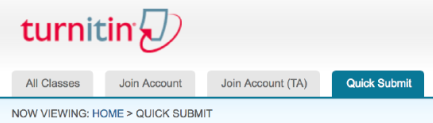 The quick submit feature allows instructors to submit papers and receive Similarity Reports without creating a class or an assignment. This is ideal for instructors who would like to use Turnitin to spot check submissions and have these papers in electronic format. Quick submit should not be used if the instructor desires to have students submit their own papers or plans on using Peer Review, GradeMark, or GradeBook.