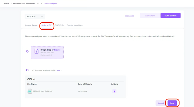You can upload your CV file in the “Upload CV” section. After uploading your file, click on the “Save” button to save it.