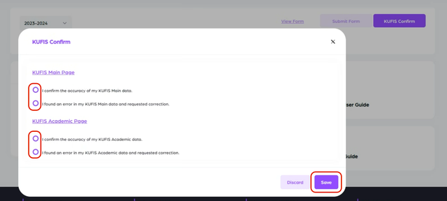 After clicking the “KUFIS Confirm” button, you can check the boxes in the popup window and save by clicking the “Save” button.