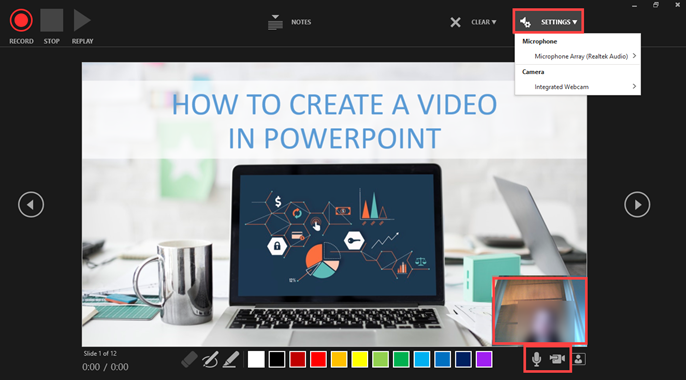 You can record audio or video narration as you run through your presentation. The buttons at the lower-right corner of the window allow you to toggle the microphone, camera, and camera preview on or off: