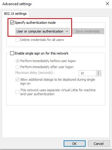 In the new window, choose "User or Computer Authentication" at the top and then click on "Delete Credentials."