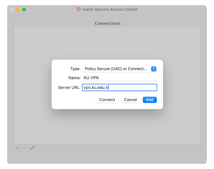 Click on plus sign (+) to add a new connection. Enter the desired name and the Server URL: vpn.ku.edu.tr.