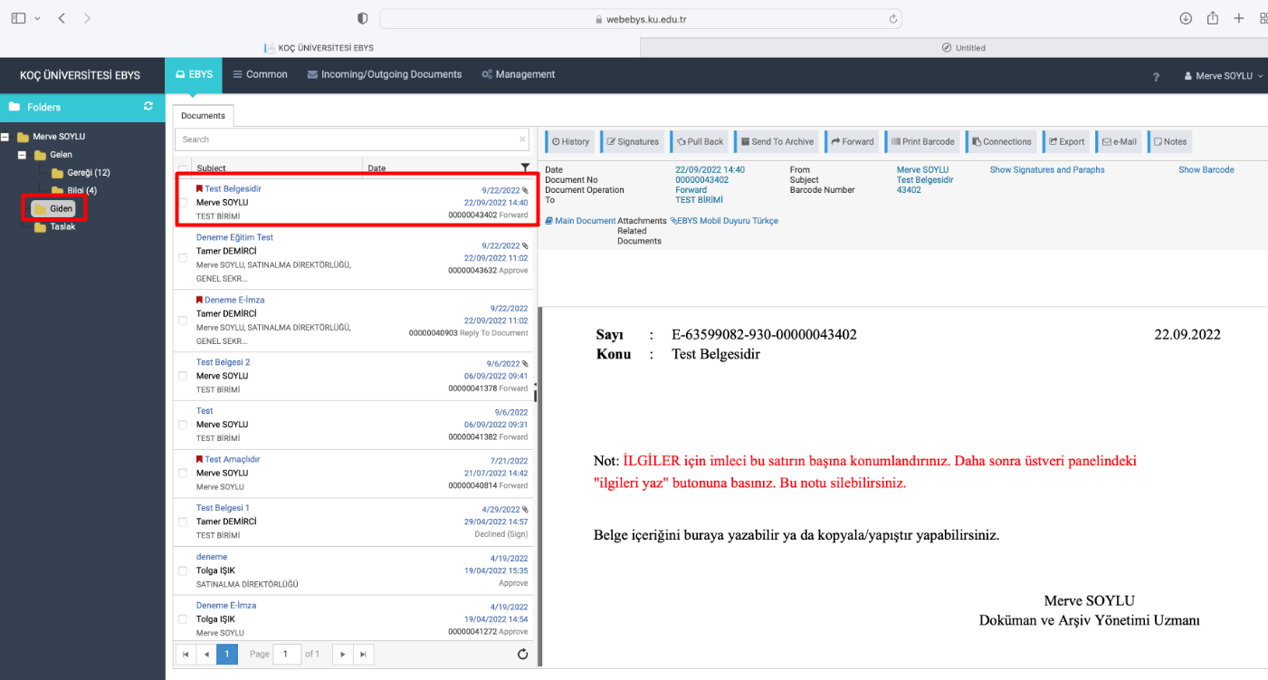 After the approval/paraph/signature processes, the documents can be viewed in the "Giden" folder and you will be able to view your document from here whenever you want.