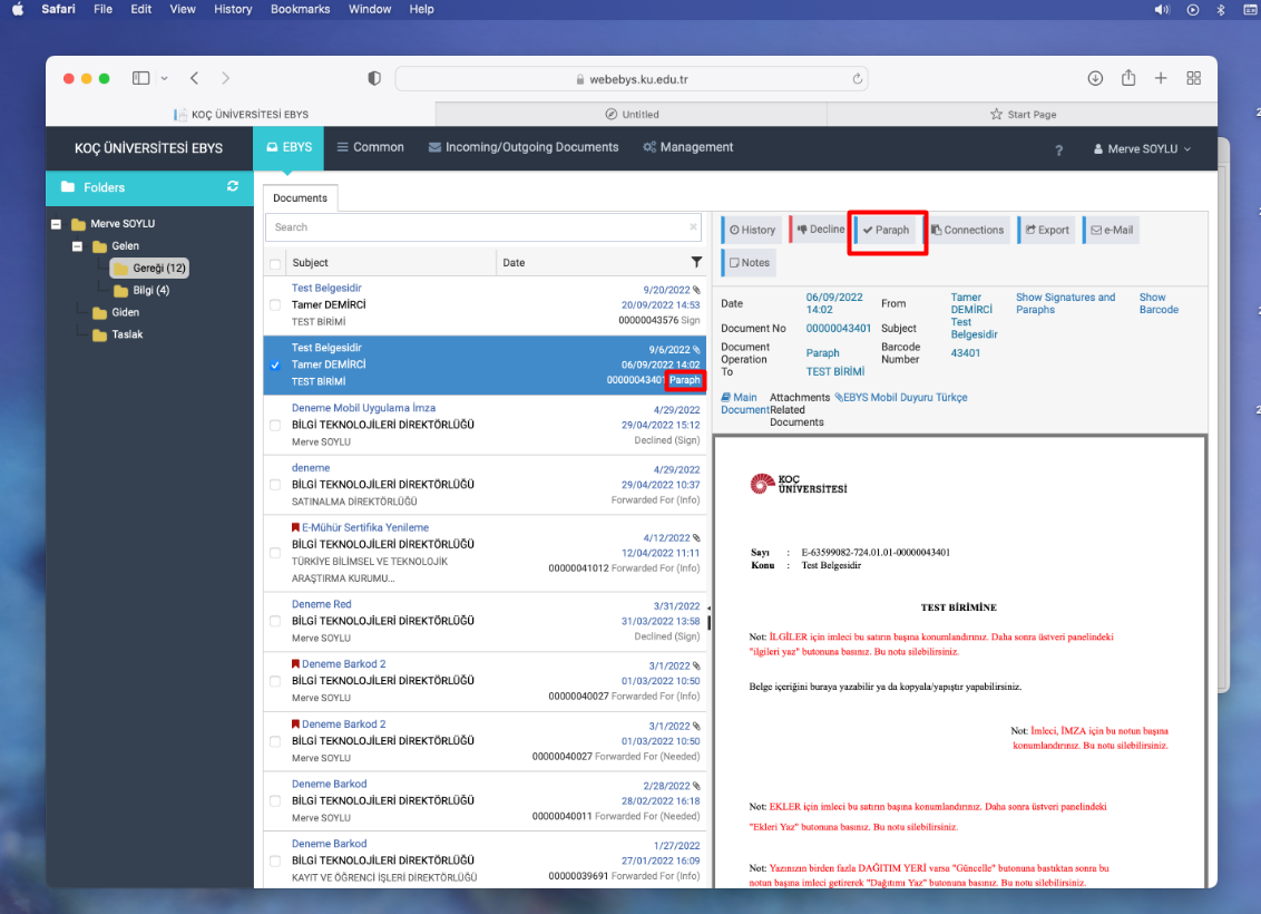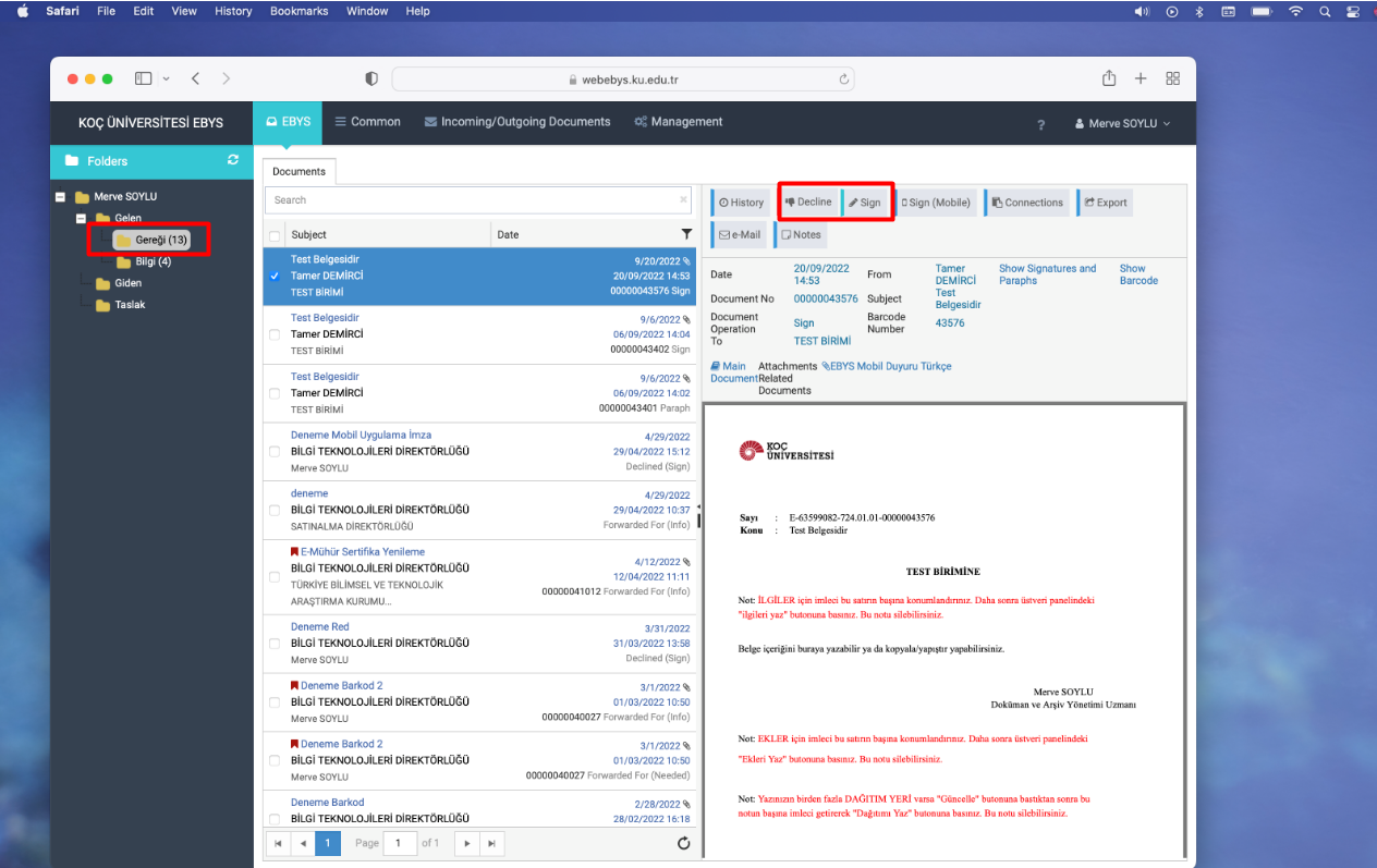In electronically sent documents, there are three types of approval: Paraph, Approval, and Signature. These documents sent to you can be viewed in the "Gereği" folder. In the lower right corner of the documents in the "Gereği" folder, there is information about the document's approval type. You have two options when the document is displayed: Decline and Approve /Paraph/Sign.