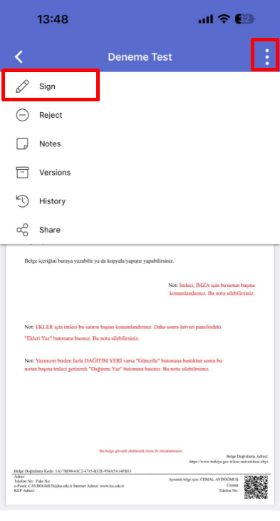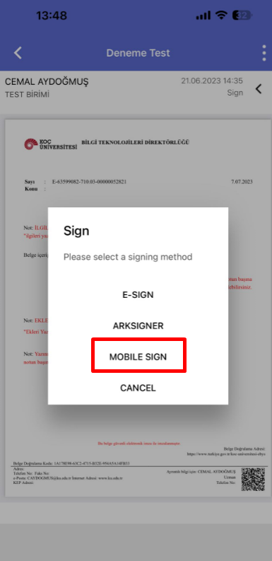 A pop-up will appear on the mobile phone where your mobile signature is defined. When you pass the confirmation screens, you can complete your signature process by entering your 6-digit pin that you created during your mobile signature application.