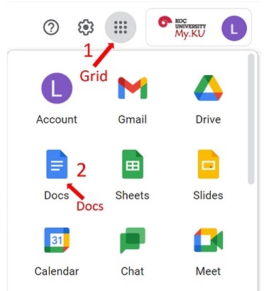 To access this tool, log in to MY KU Gmail from MY.KU Portal. Once in your student email click on the grid icon in the upper right, if you hover over this icon with your mouse it will display Google Apps, and select the docs option. Then create a new blank document. Turnitin Draft Coach only works in a new blank document.