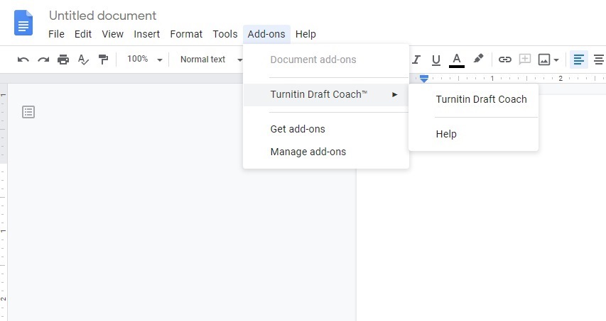 On a Google document, choose Add-Ons and Turnitin Draft Coach.