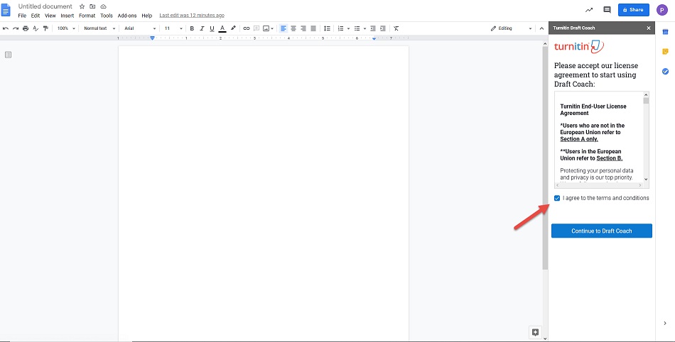 A sidebar will open on the right. To use Turnitin Draft Coach, check the box in front of “I agree to the terms and conditions.” Choose Continue to Draft Coach.